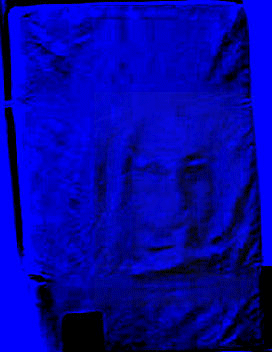 Beaucoup pensent que l’apparition du visage sur le dossier ressemble étrangement à celui du Saint Suaire de Turin. J’ai donc voulu comparer les deux images, si l’image prise à l’église « Jésus Miséricordieux » de Cambuston à Saint-André est bleue, c’est que j’ai voulu faire ressortir les reliefs et voilà ce que ça nous donne :
