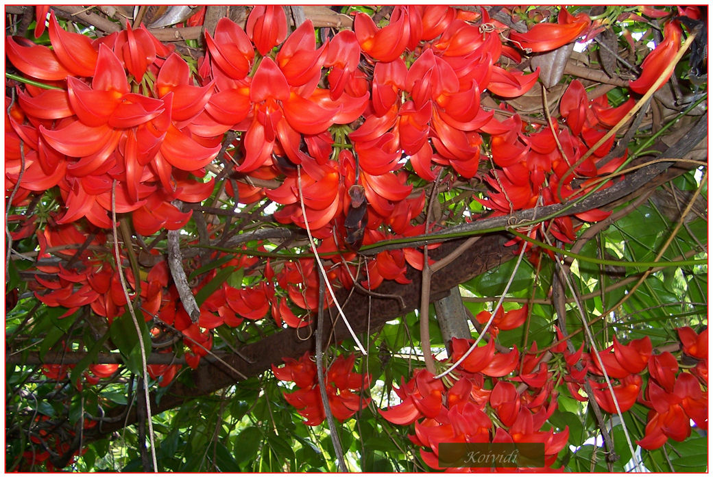 Bien que les arbres soient le support le plus adéquat pour cette plante, ici on la retrouve sur les clôtures et sur les tonnelles. Sa floraison est spectaculaire, les clôtures sont pour l’occasion repeintes en rouge corail et les tonnelles revêtent un plafond avec des griffes rougeoyantes. Un vrai plaisir pour les yeux.