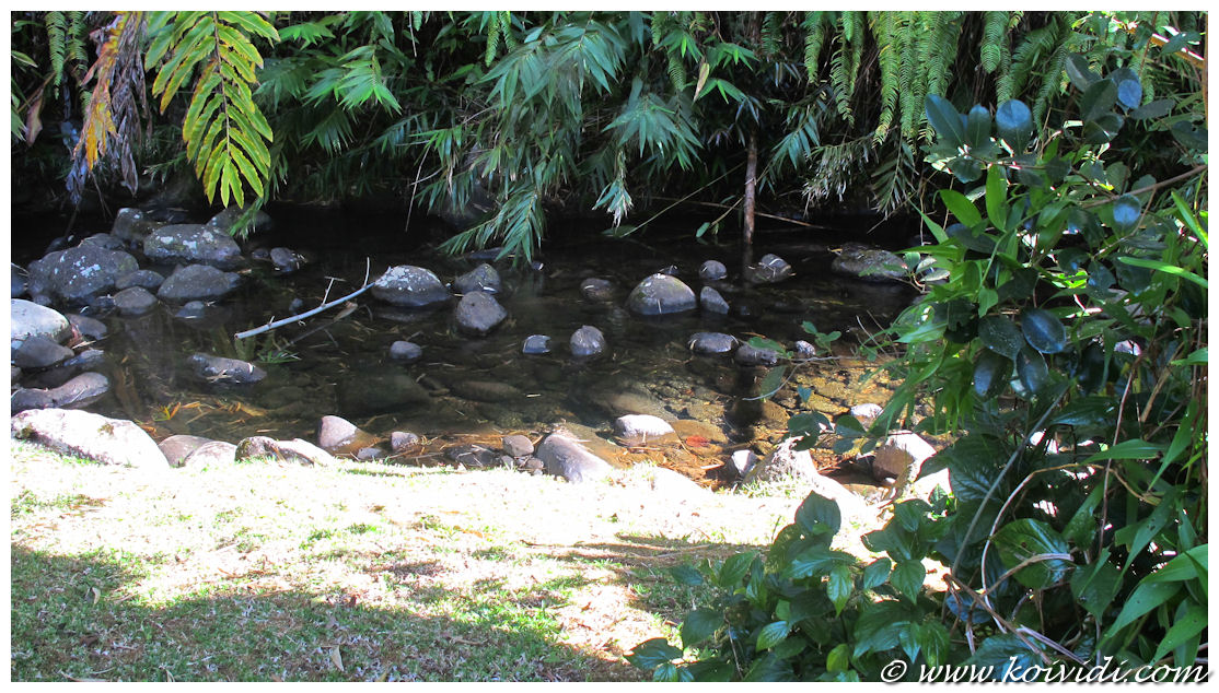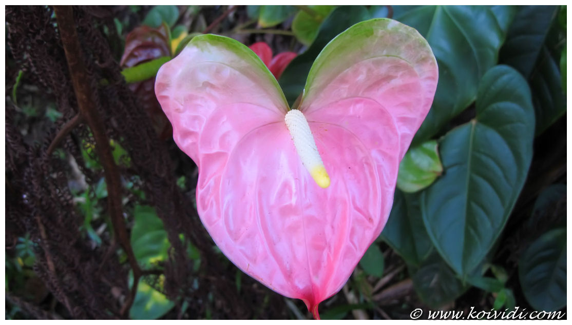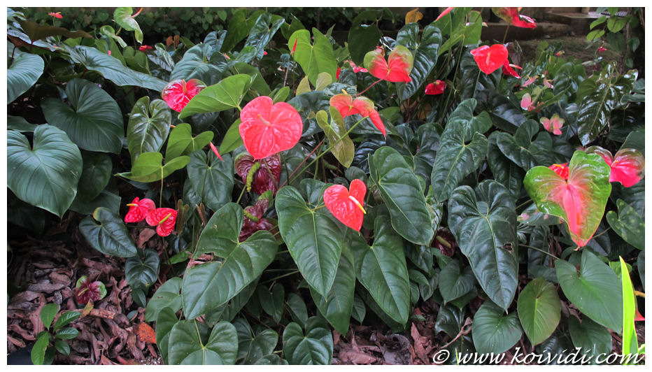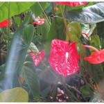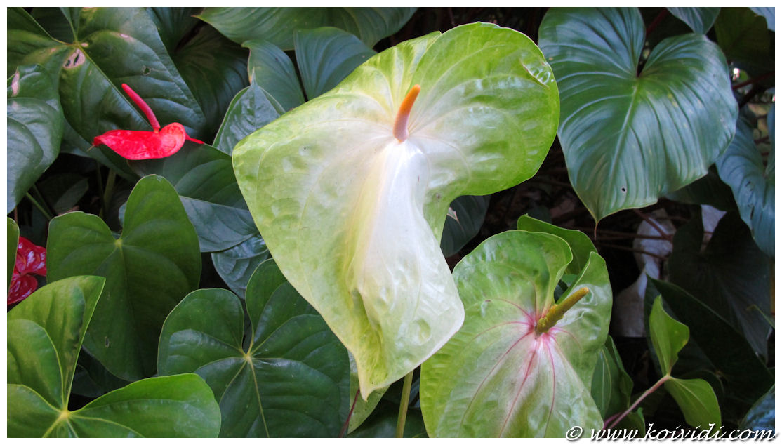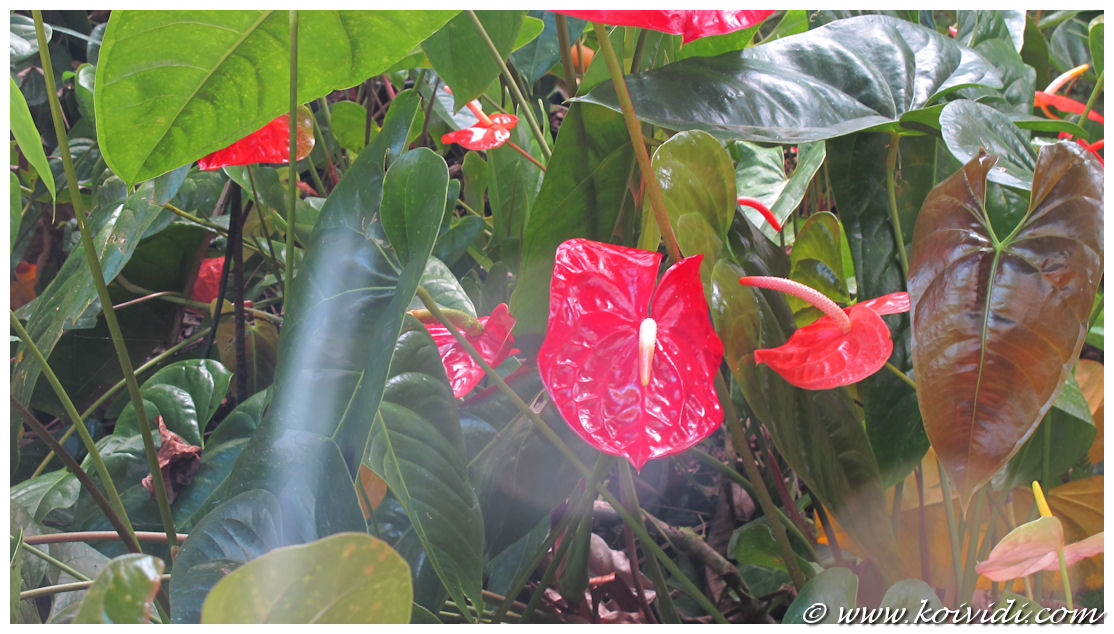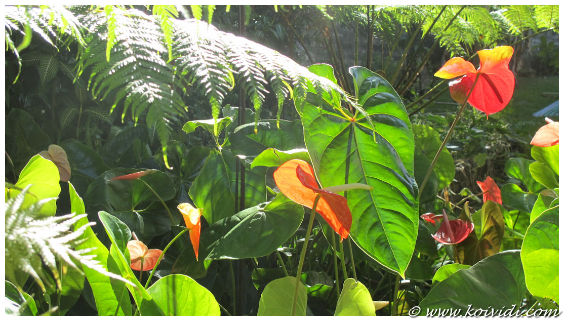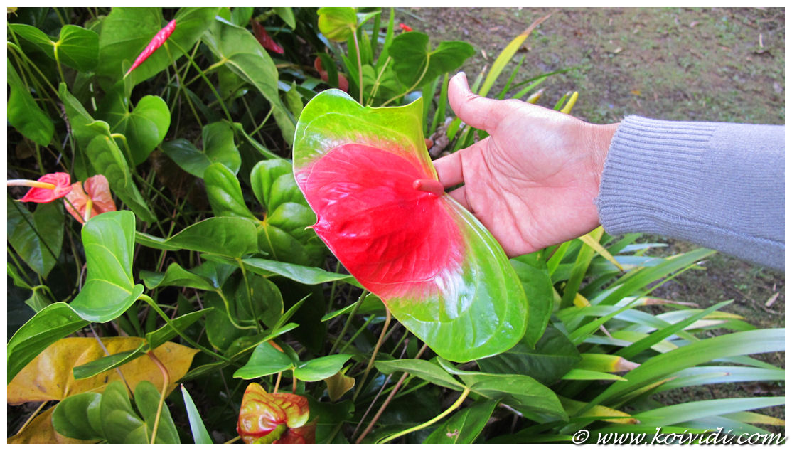 En vrac, nous avons pu voir dans ce jardin, des hibiscus, une large variété d’anthuriums, des camélias, des roses du désert, de la citrouille, des pommes en l’air, en pied de tomates, un poivrier, un citronnier, un papayer, un macadamia, des azalées, des évis, un cacaoyer, un sapotier, des kumkats, un cocotier,des combavas, un pied de letchis, du piment, un arbre à fuit à pain, un pied d’jacques, des concombres…