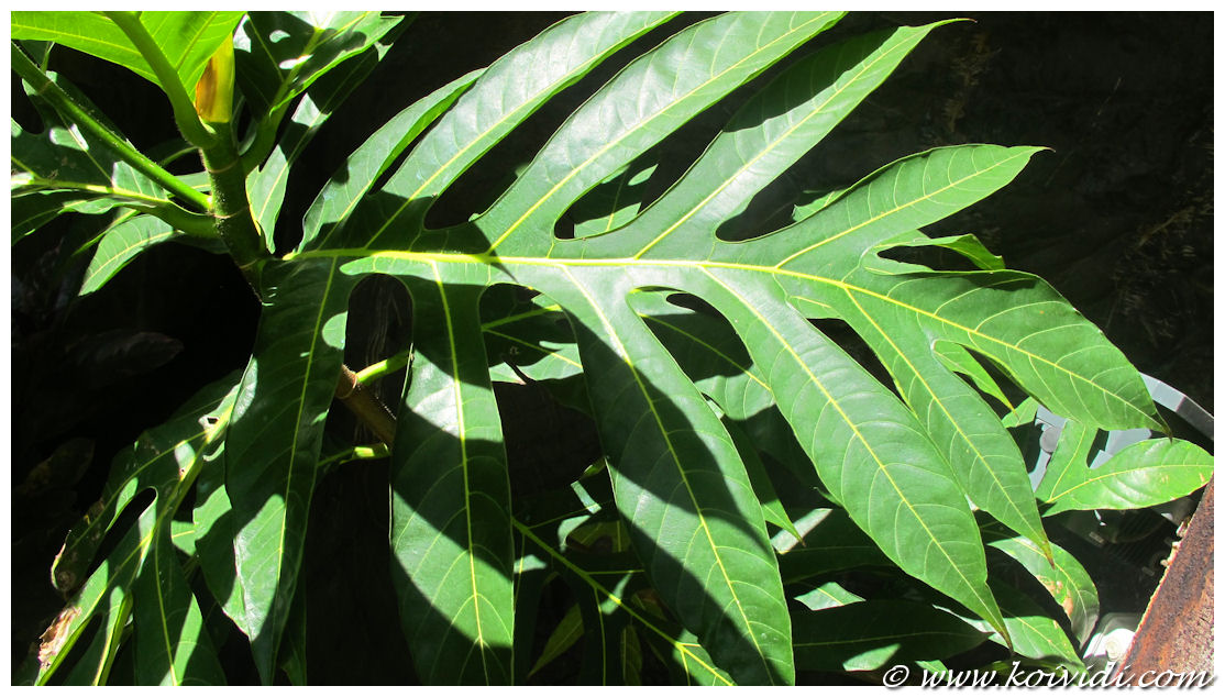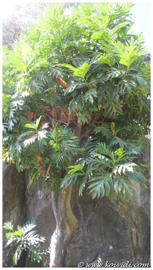 L’arbre à pain (artocarpus altilis) est de la famille des Moraceae et il est originaire de Polynésie. Il peut atteindre jusqu’à 20 mètres de hauteur. Il est aussi connu sous les noms de châtaigner pays ou châtaigner de malabar.