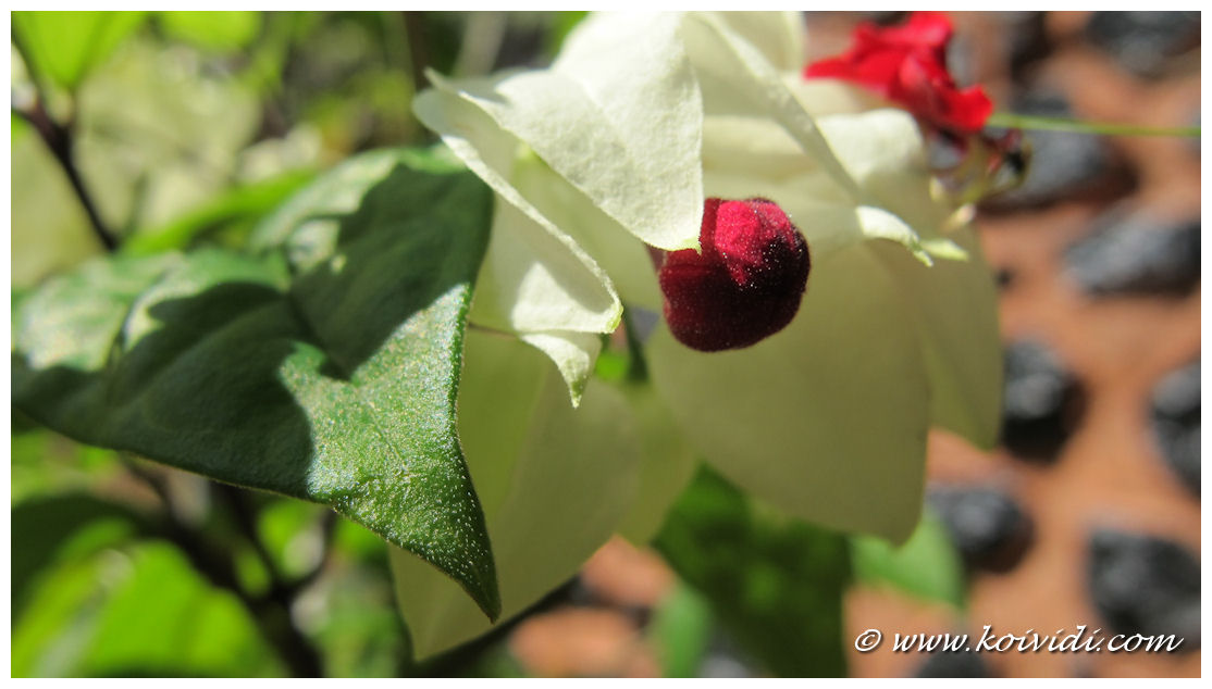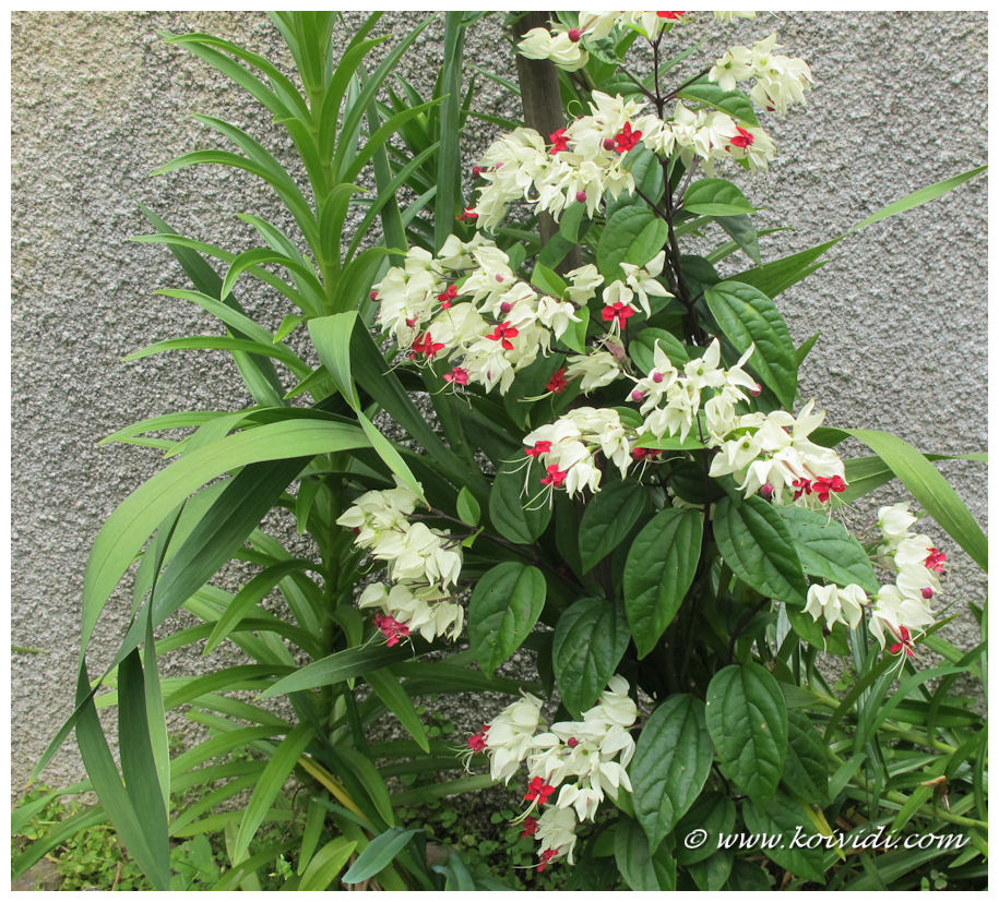 Les fleurs du Clérodendron apparaissent sous forme de grappes. Elles sont en forme de clochettes, avec des calices blanc qui virent au rose et qui laissent s’échapper les corolles de pétales rouge cramoisi, ainsi que de longues étamines vertes.