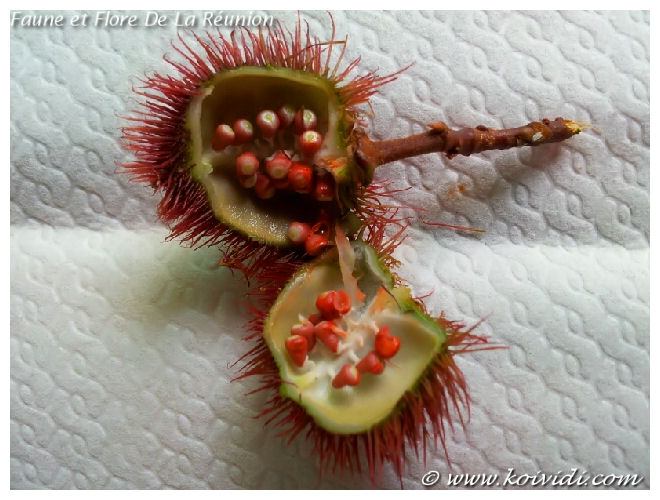 Le rocouyer est présent dans certains jardins créoles, j’en ai aussi aperçu sur certaines places publiques de la ville du Port.