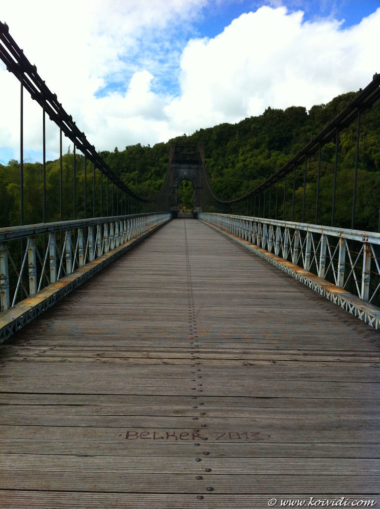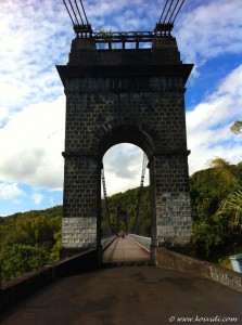 Notre première pause de la journée se fera au pont suspendu de la Rivière de l’Est. C’est un pont réservé uniquement aux piétons et qui fait la jonction entre Saint-Benoît et Sainte-Rose. Cet édifice a été livré en 1894 et a été remplacé en 1979 par le pont en béton en amont.