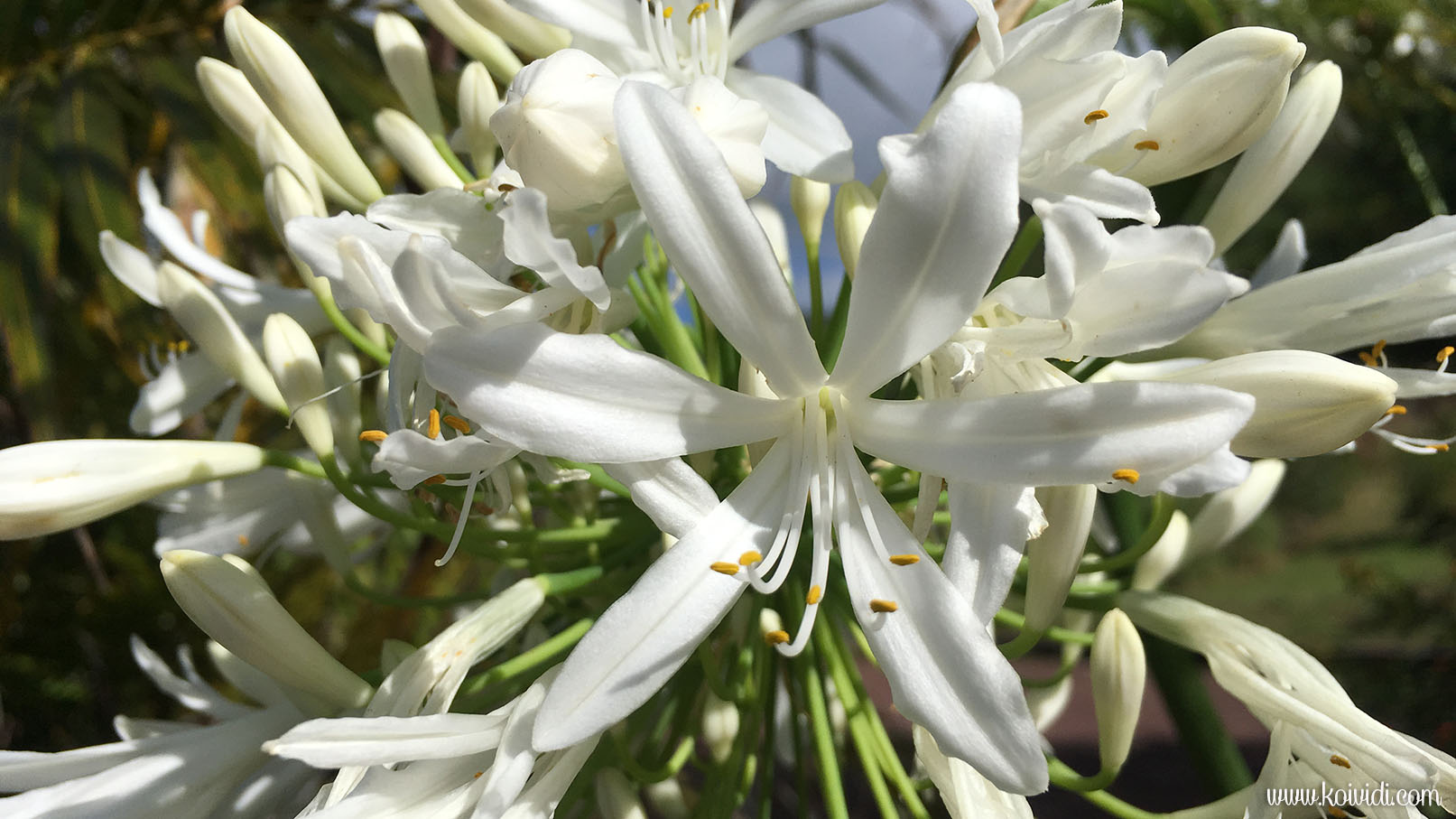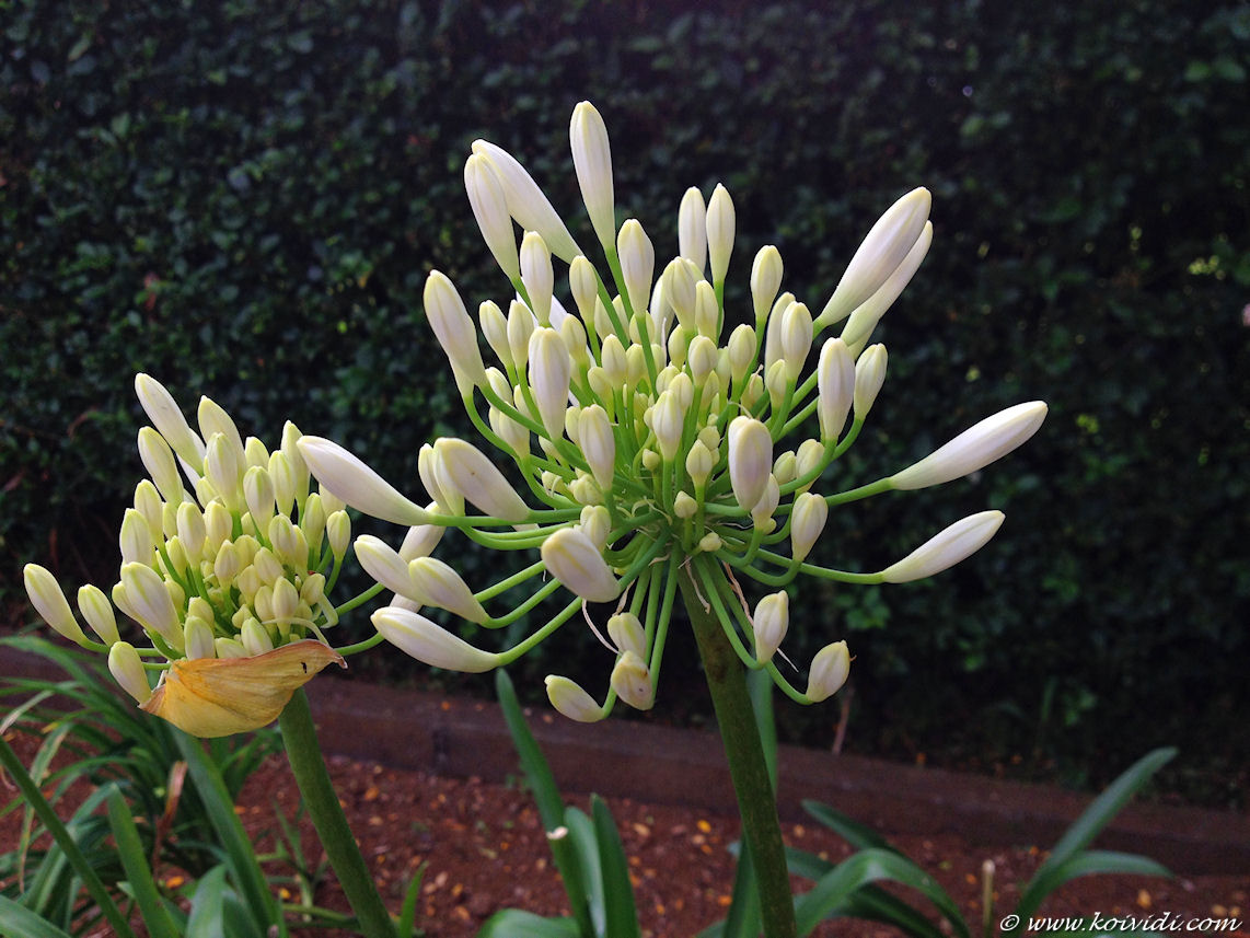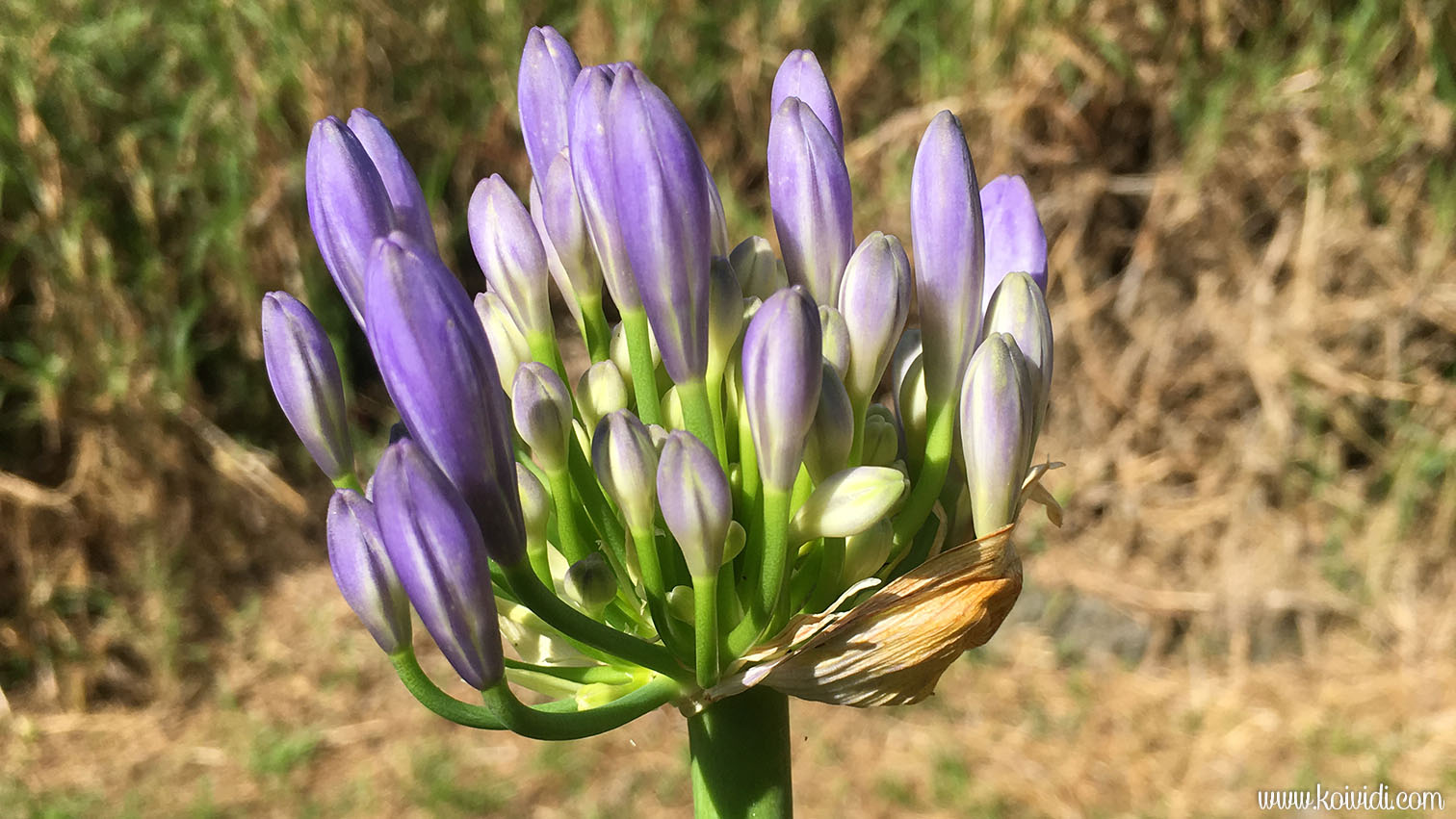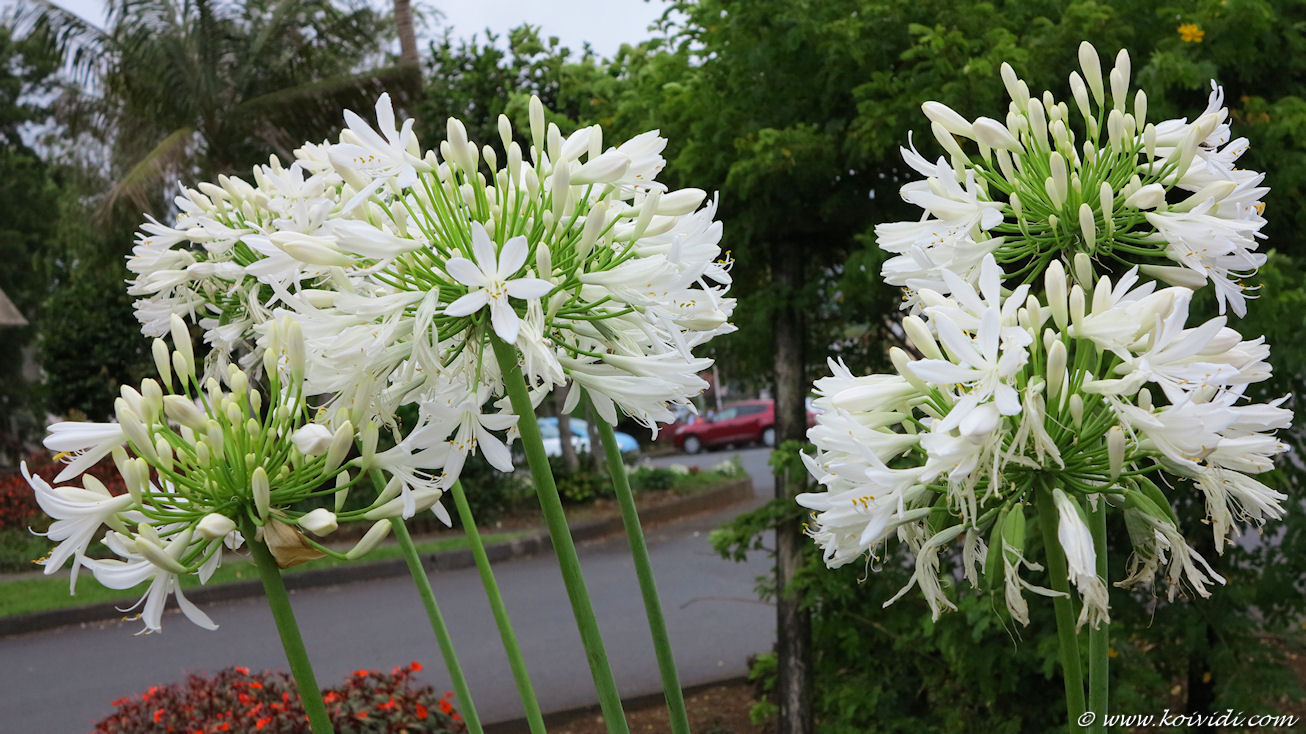 Vers le mois de novembre l’agapanthe commence à donner de somptueuses fleurs qui apparaissent sous forme de boules, d’ailleurs à la Réunion certains l’appellent « boule de blanc » ou « boule de bleu ». L’agapanthe est aussi connue sous les noms de lys du Nil ou tubéreuse bleue.