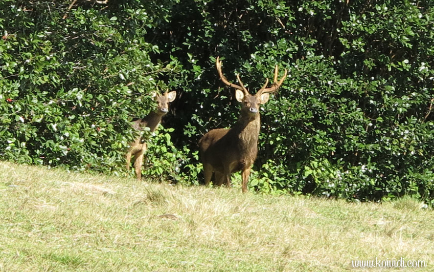Durant notre séjour, nous nous sommes rendus à la rencontre des cerfs à 2 reprises. La 1ère fois, nous avions profité de leur pause repas pour pouvoir s’approcher au plus près. Au menu il y avait des feuilles d’avocat  marron et de cassie ou mimosa.