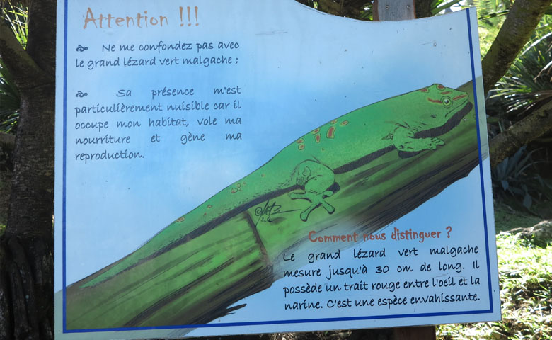 Par ailleurs, l’introduction d’espèces végétales envahissantes mais aussi animales comme le Gecko vert malgache contribuent également à la diminution du nombre de Gecko de Manapany.