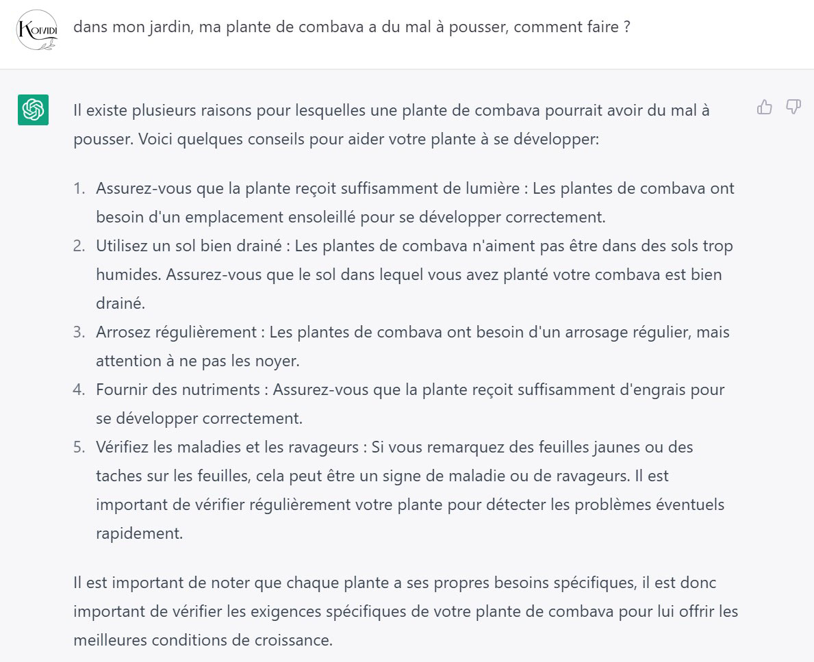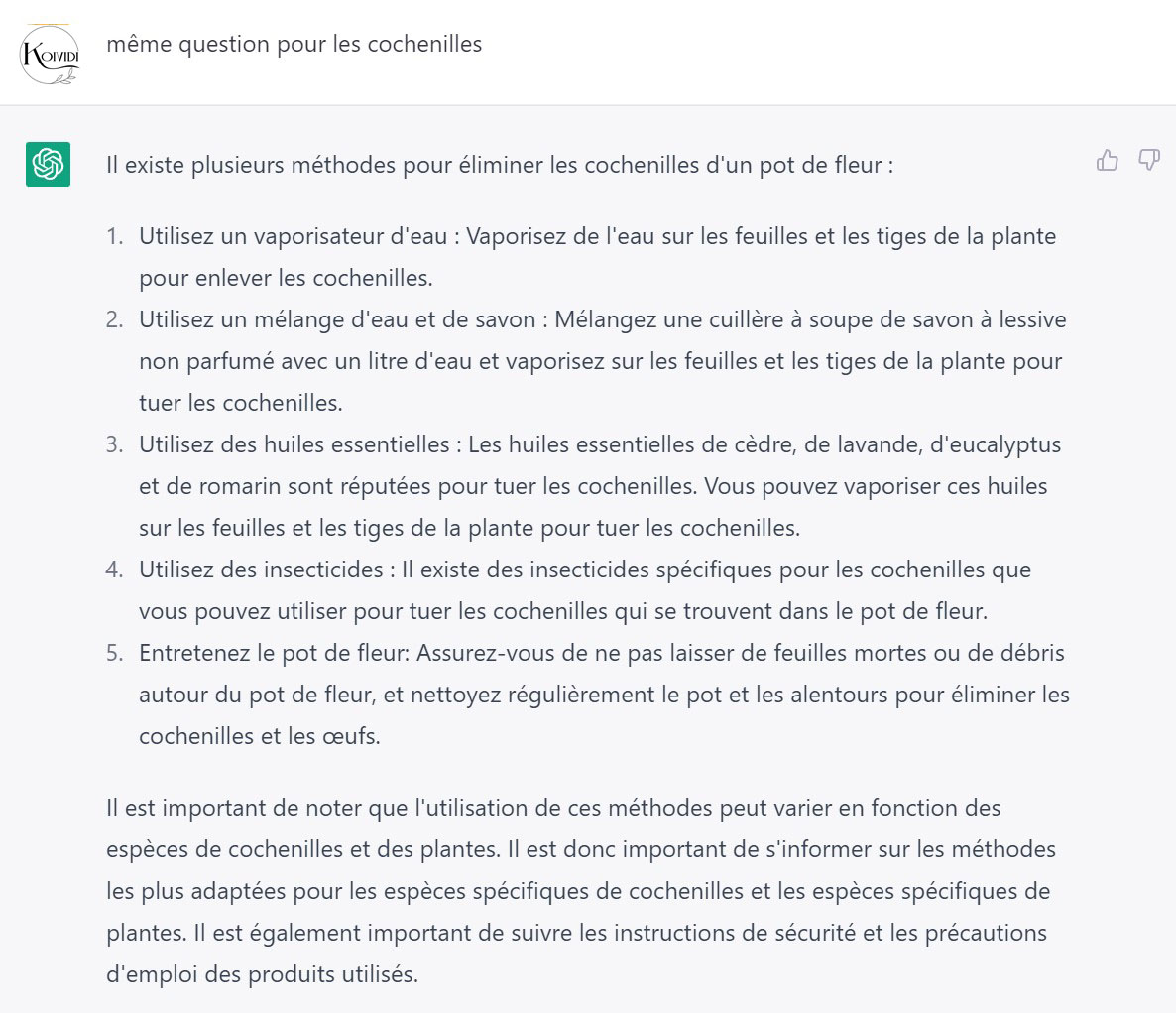 Même question concernant les cochenilles. A noter que ChatGPT garde le contexte de la conversation. Il n’est pas utile de rappeler les éléments de la question précédente.