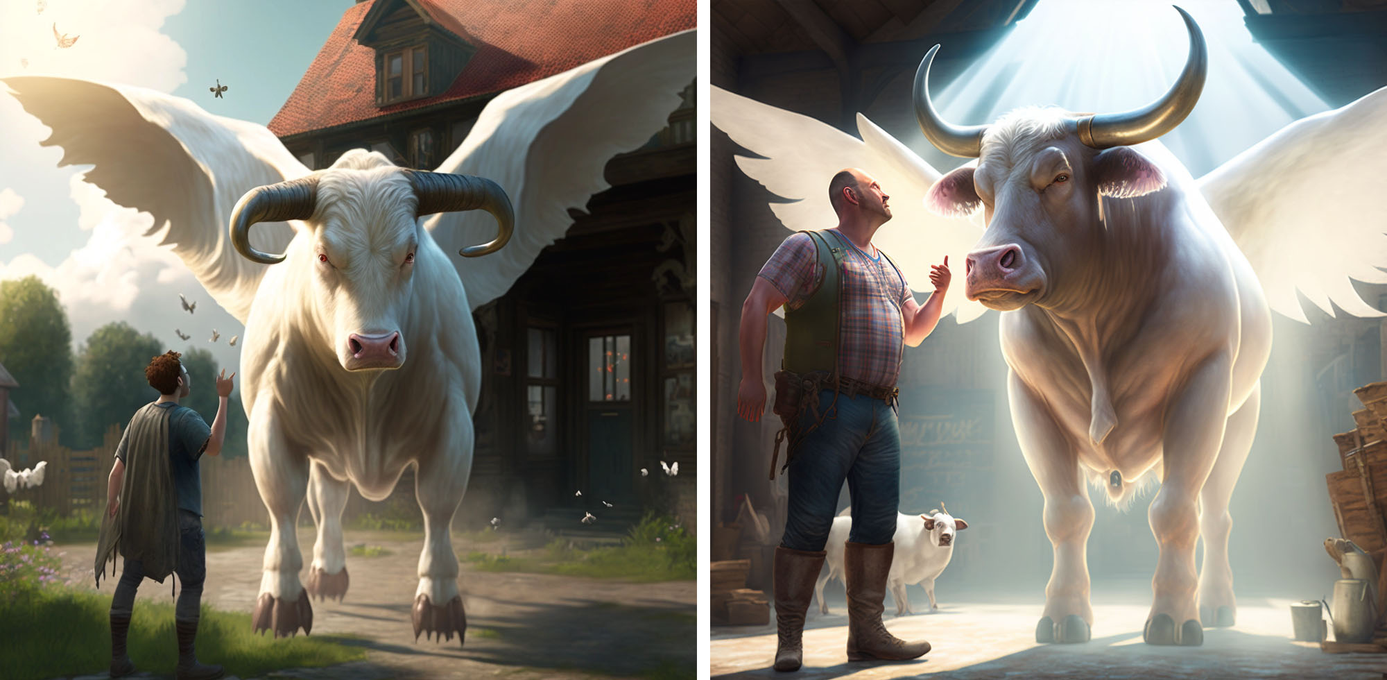 Mon texte pour générer l’image : A villager witnessing a large flying cow with giant angel wings, photorealistic, 8K, ray tracing.