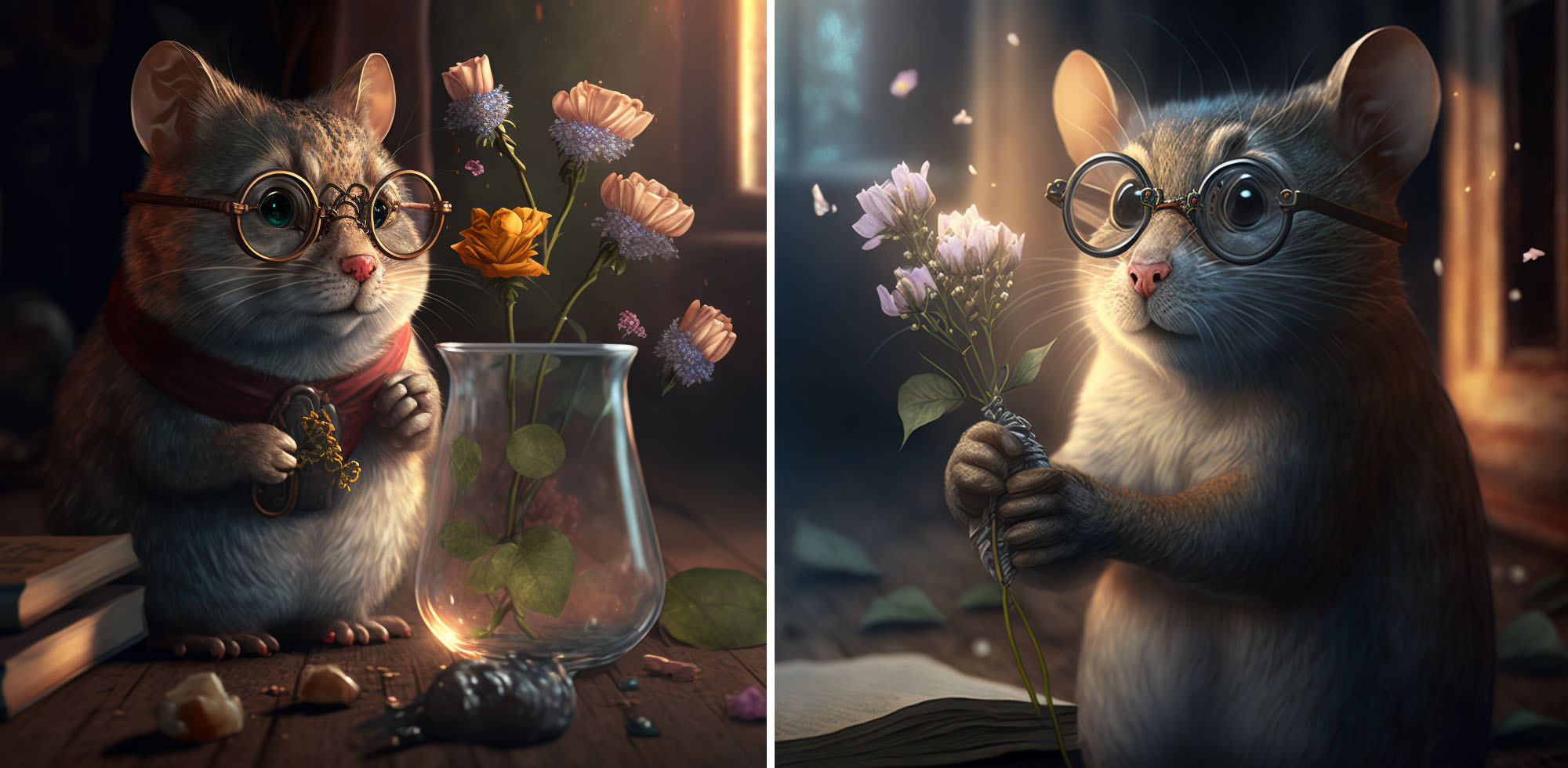 Comme on peut le constater il y a quelques imperfections et incompréhensions. Notamment avec le chat qui devait offrir des fleurs à une souris. Ainsi, on se retrouve avec une fusion des 2 animaux. Aussi, J’ai constaté que l’IA a du mal avec les mains. On se retrouve souvent avec des personnages à six doigts.
