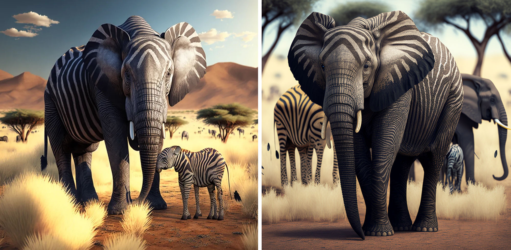 Mon texte pour générer l’image : Elephant with Zebra skin in the savana with other normal elephants, photorealistic, 8K, ray tracing