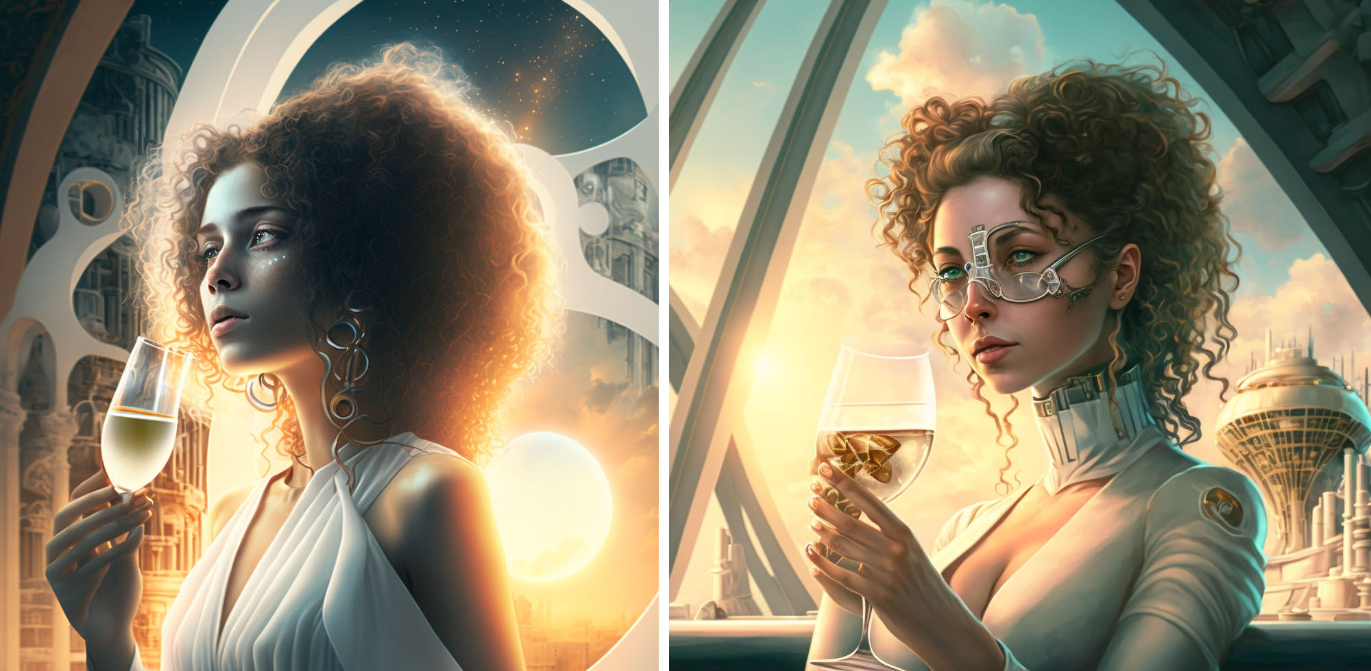 Mon texte pour générer l’image : Pretty woman with curly hair drinking a glass of white wine in a heavenly and futuristic setting
