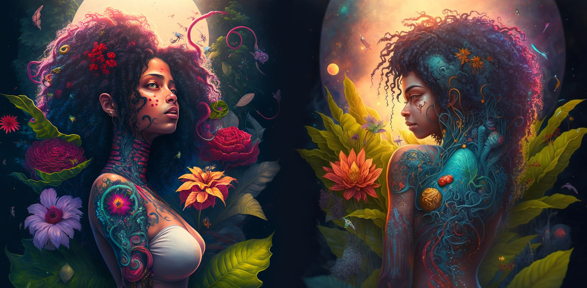 Mon texte : woman with curly hair, with tatoo on arm, in an alien garden with carnivorous plants, 4k, all details, colorfull, sun, moon.Continue reading →