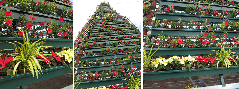 En effet, sur le parvis de la mairie du Tampon, c’est un sapin pour le moins original qui a pris place. Il fait environ 10 mètres de hauteur, avec une circonférence au sol de 7 mètres. Ce sont plus de 2 000 pots de fleurs qui ont servi à la décoration de la structure. Ainsi de jour nous voyons un sapin haut en couleur avec des dipladénias rouges et blanches et des poinsetias rouges et jaunes. Continue reading